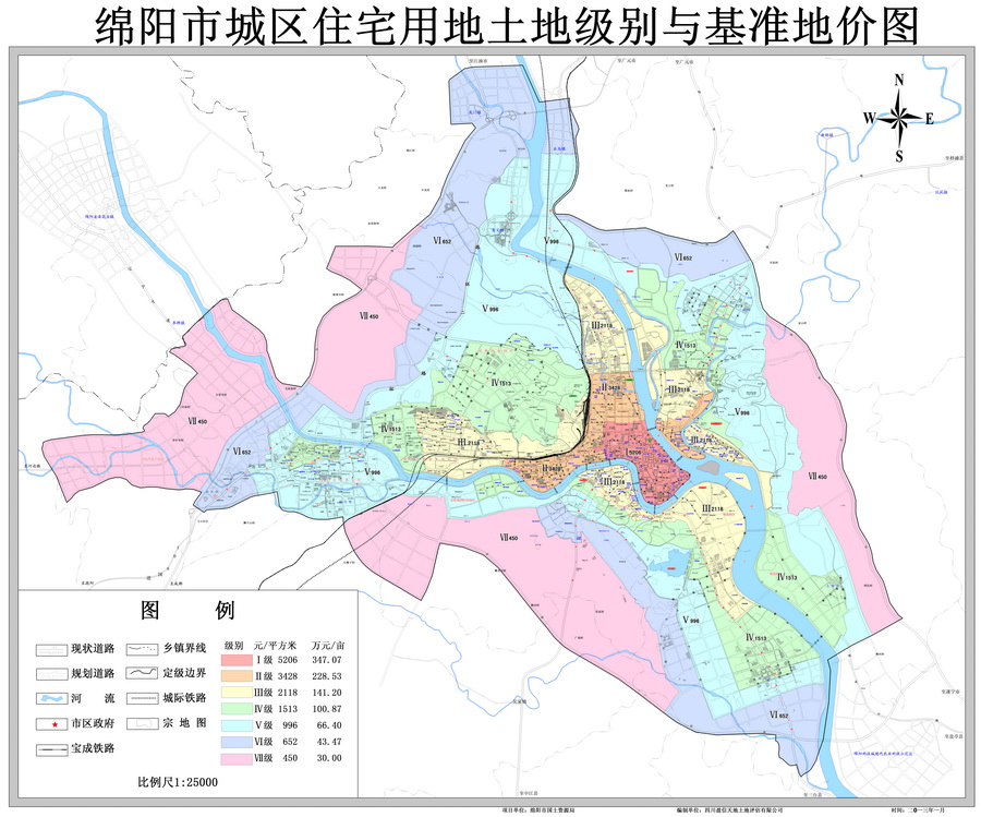 绵阳市城区住宅用地土地级别与基准地价图(2013年)