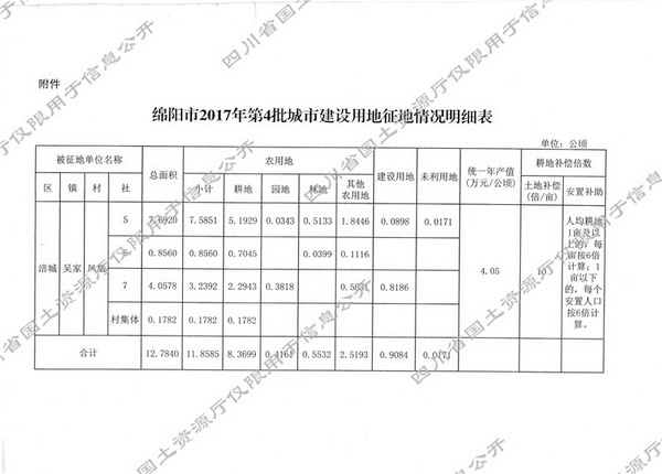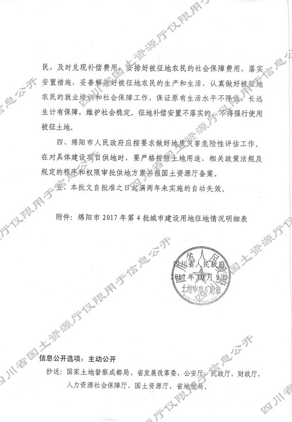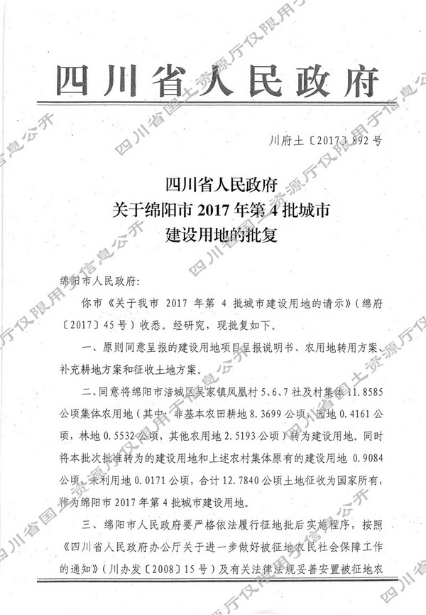 四川省人民政府关于绵阳市2017年第4批城市建设用地的批复(川府土[2017]892号)
