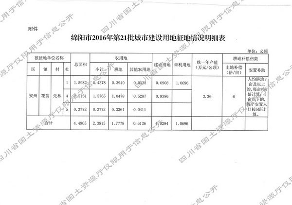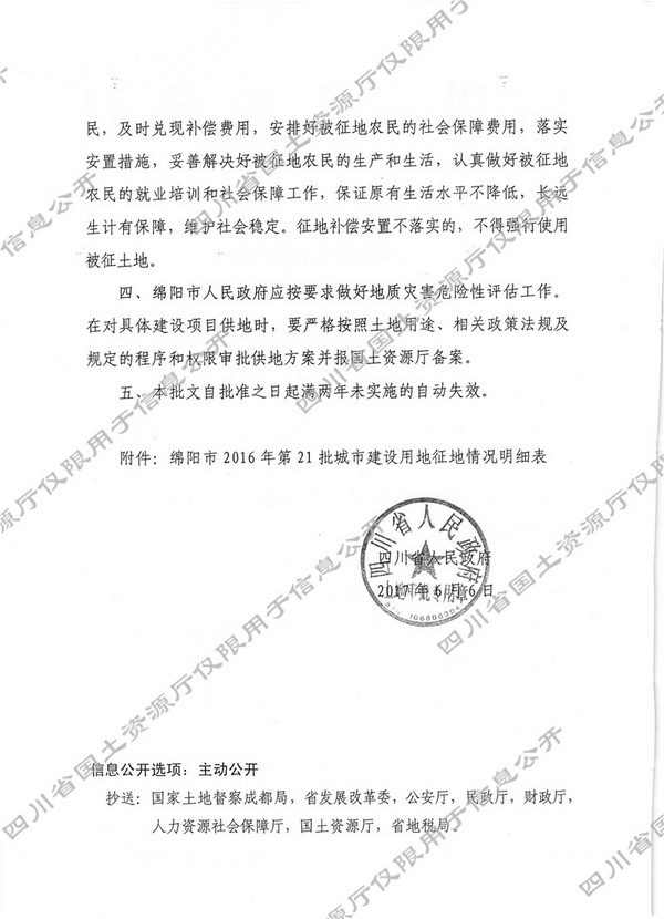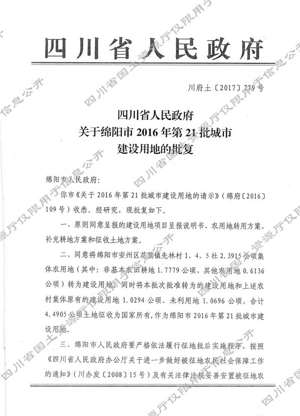 关于绵阳市2016年第21批城市建设用地的批复(川府土[2017]779号)
